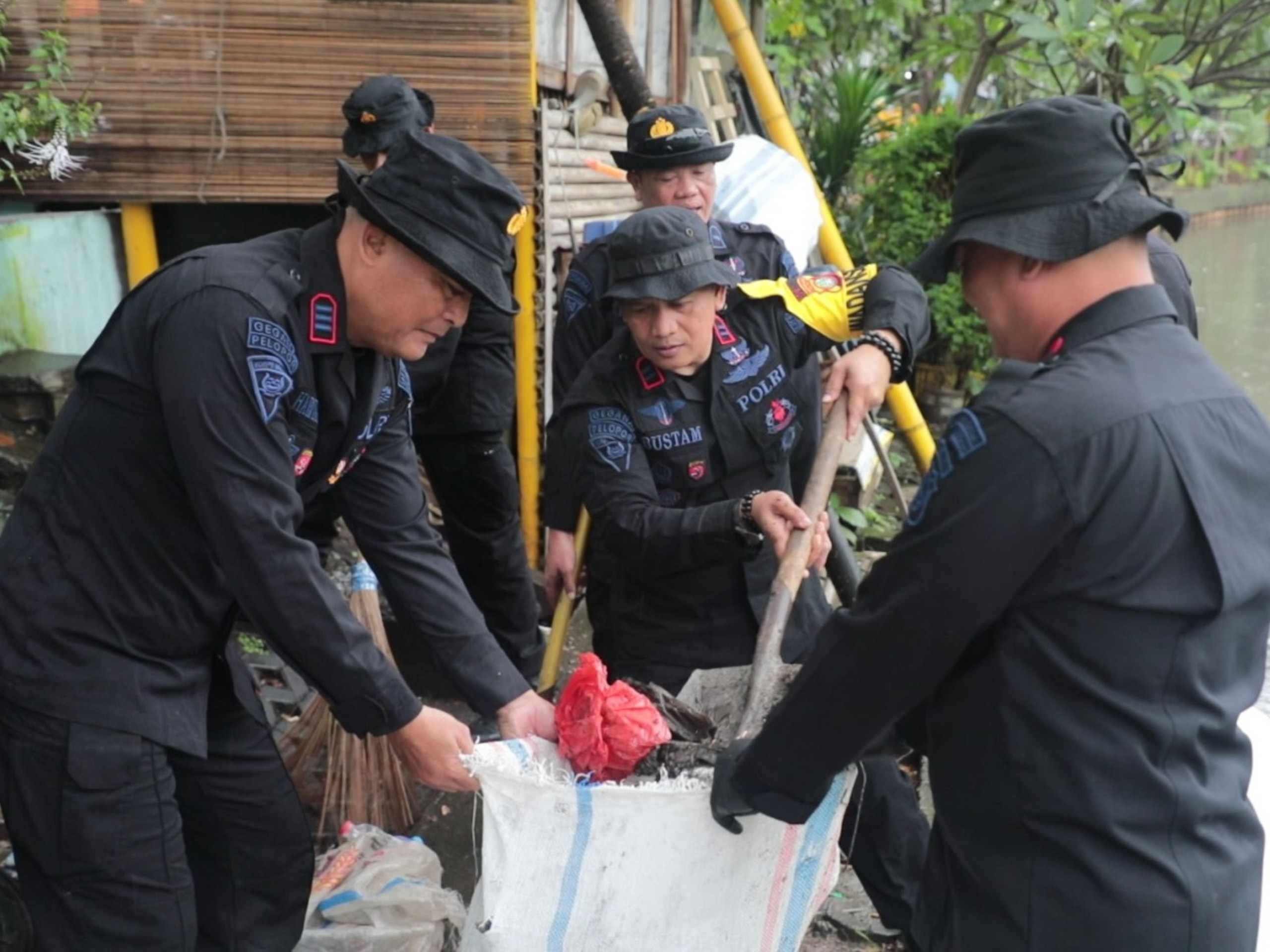 Sebanyak satu pleton personel Brimob diterjunkan bersama unsur terkait untuk membersihkan sampah dan puing yang menumpuk di bantaran Kali Grogol. Aksi kerja bakti dilakukan secara kolaboratif guna menciptakan lingkungan yang lebih bersih dan tertata.