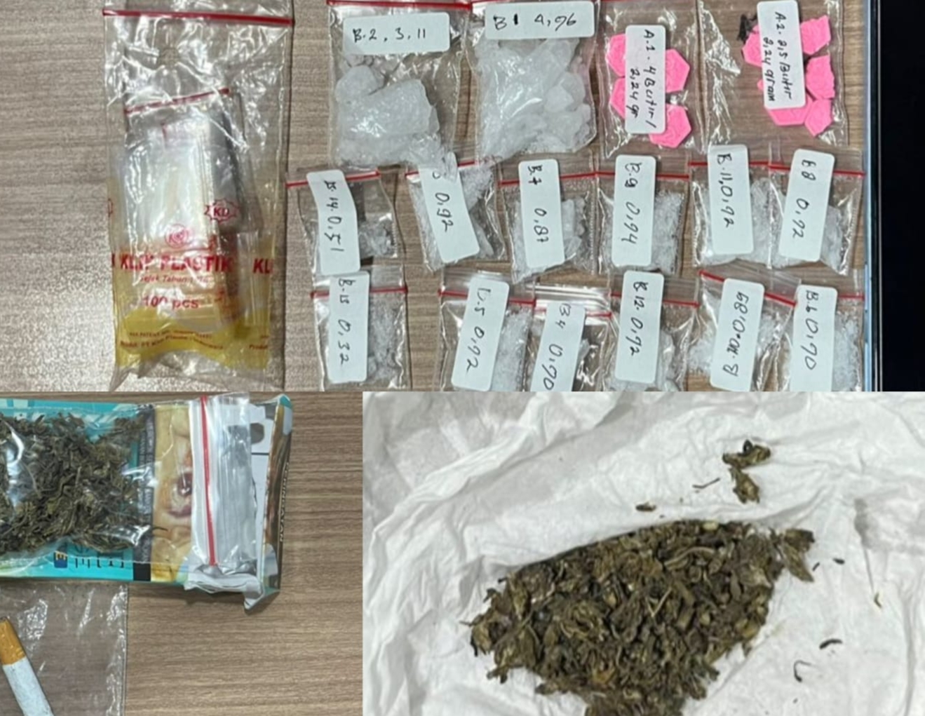 Dari lokasi kejadian, petugas menemukan sejumlah barang bukti narkotika yang diduga digunakan dalam pesta narkoba tersebut, yakni ekstasi seberat 5,48 gram, sabu seberat 18,35 gram, serta ganja dengan total berat sekitar 5 gram.